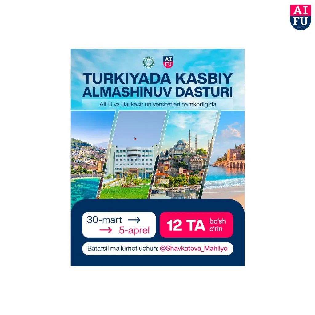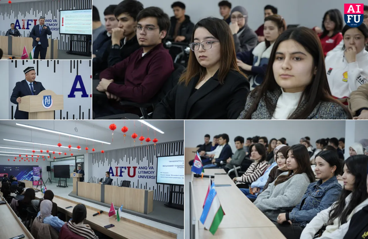 AIFU universitetida muntazam ravishda ta’lim, ilm-fan va madaniyat sohalariga oid turli tadbirlar o‘tkazib kelinadi. Har bir tadbir talabalarning bilim va ko‘nikmalarini kengaytirish, xalqaro tajriba almashinuvi hamda ilmiy hamkorlikni mustahkamlashga xizmat qiladi.